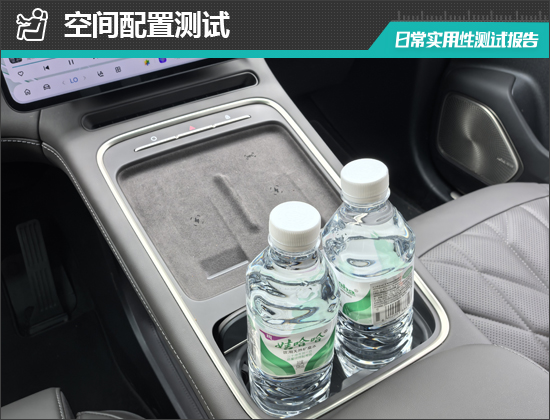 经过实测,评测车的储物数量较多,除了没有配备专属的眼镜盒外,其余物品均能找到合适的位置摆放,储物能力较为出众。此外,评测车提供了4个杯架,均配备限位器。