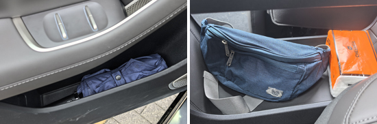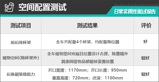 对于车内使用空间的测试,只针对前排触手可及的空间,不包括手套箱、中央扶手箱等需开启的空间。测试方法是将以下固定物品全部放置在前排的各个储物空间内,通过固定物品的放置情况来判断车辆储物空间的表现。测试选定的固定物品为:2瓶常规大小的矿泉水、1部大屏手机、1支口红、1个挎包、1副墨镜、1把折叠雨伞以及1包常规尺寸的抽纸。