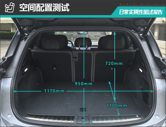 对于后备厢的基础数值,我们也进行了实测,开口长度为950mm;开口宽度为1170mm;后备厢进深为1100mm;后备厢地台与顶部的垂直高度为720mm。