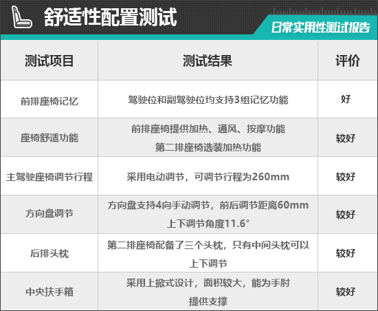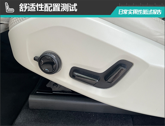 座椅方面,评测车前排座椅调节按键位于座垫侧面,调节按键位置合理,操作便捷。同时,评测车前排座椅提供加热、通风、按摩,第二排座椅加热功能为选装配置,舒适性表现不错。