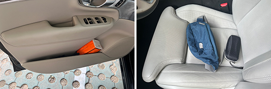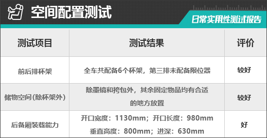 对于车内使用空间的测试,只针对前排触手可及的空间,不包括手套箱、中央扶手箱等需开启的空间。测试方法是将以下固定物品全部放置在前排的各个储物空间内,通过固定物品的放置情况来判断车辆储物空间的表现。测试选定的固定物品为:2瓶常规大小的矿泉水、1部大屏手机、1支口红、1个挎包、1副墨镜、1把折叠雨伞以及1包常规尺寸的抽纸。