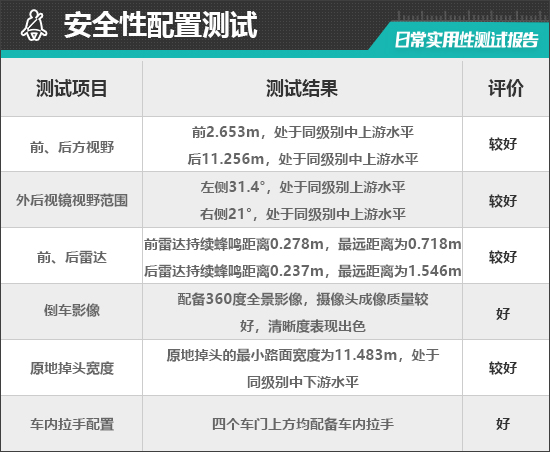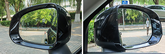 评测车左侧外后视镜采用双曲率镜片,右侧外后视镜为普通镜片。经实测,左、右外后视镜视野范围分别为31.4°和21°,分别处于同级别上游水平和同级别中上游水平。