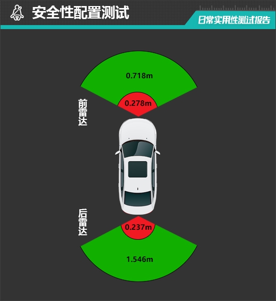 在测试过程中,倒车雷达在1.546m处可感应到后方物体,雷达功率表现不错。从实测数据来看,评测车的倒车雷达持续蜂鸣提示距离为0.237m,与同级别测试均值稍有差距。