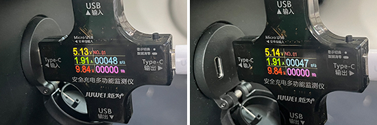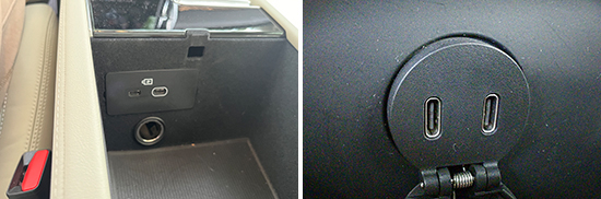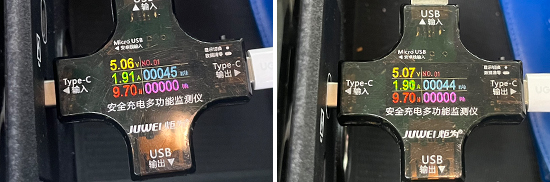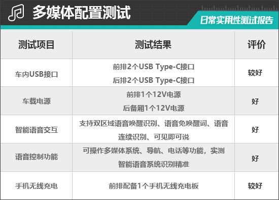 在车内USB接口方面,评测车前/后排各配备了2个USB Type-C接口,种类较为单一。同时,前排和后备厢各提供1个12V电源。此外,我们对USB接口的电压、电流、充电功率进行了测试,其中,前排2个USB Type-C接口的电压、电流、充电功率分别在5V、1.9A、9.7W左右;后排2个USB Type-C接口的电压、电流、充电功率分别在5.1V、1.9A、9.8W左右。