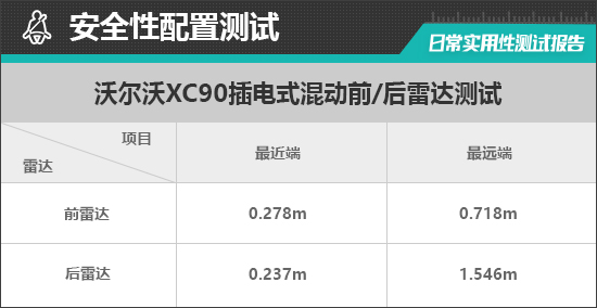 前驻车雷达最远可在0.718m处感应到前方物体,雷达功率表现中规中矩;持续蜂鸣提示距离为0.278m,与同级别测试均值同样有所差距。