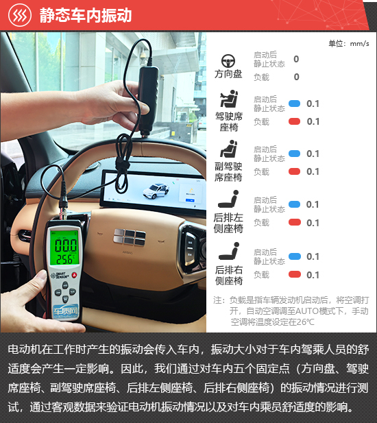 在静态车内振动测试环节,启动后静止和负载两种状态下,2025款吉利银河星舰7 EM-i方向盘处的振动数值始终为0,前后排座椅的振动数值均为0.1mm/s且保持不变,实际体感轻微。