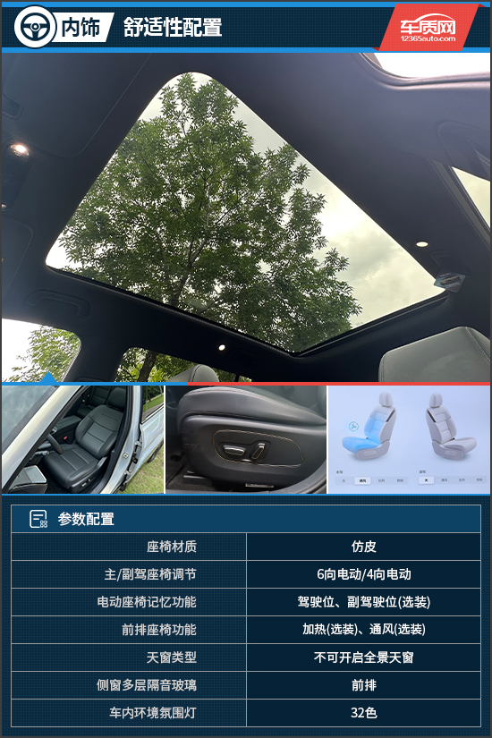 舒适性配置方面,评测车配备了不可开启式全景天窗,采光面积达到1.14m2,并配备电动遮阳帘,进一步提升车内通透感与舒适性。座椅采用仿皮材质,支持多向电动调节,内部填充物柔软,再加上选装的前排座椅加热与通风功能,乘坐舒适性表现可圈可点。