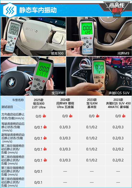 在静态车内振动测试中,领克900整体表现可圈可点,方向盘、第二排及第三排座椅在启动后静止状态下的振动数值均为0,另外座椅在负载下的振动数值也控制在较低水平。问界M9前/后排座椅在两种状态下的振动数值均为0.3mm/s,虽然数据稍逊于另外三款车型,但是好在实际体感并不明显。