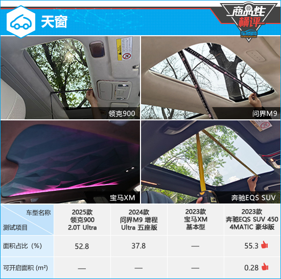 在针对天窗的测试中,只有奔驰EQS SUV配备了可开启全景天窗,面积占比和可开启面积均表现出色。宝马XM采用“浮雕穹顶”创新设计,物理菱形纹路搭配LED环境氛围灯点缀,虽不具备开启和透光功能,但确实颇具艺术美感。