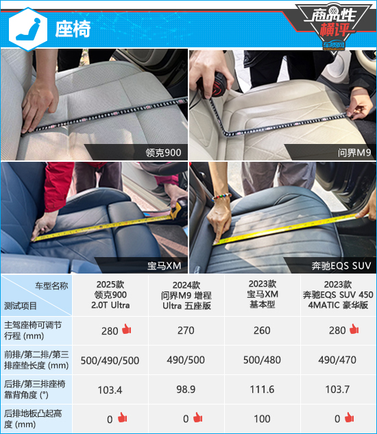 在座椅配置方面,根据已测得的数据来看,领克900和奔驰EQS SUV的主驾驶座椅行程调节范围较大,可以满足大多数驾驶者的驾驶习惯。