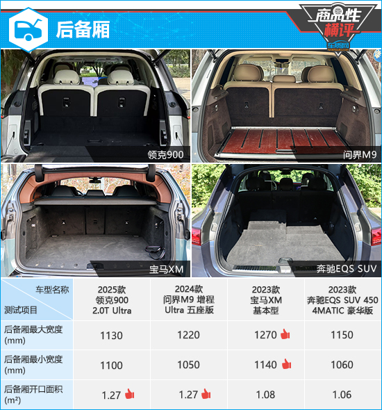 后备厢方面,从实测数据来看,宝马XM的最大宽度和最小宽度均领先于其余三款车。只可惜,受不规则开口造型影响,其后备厢开口面积偏小。对比来看,后备厢开口面积表现最好的是领克900和问界M9。