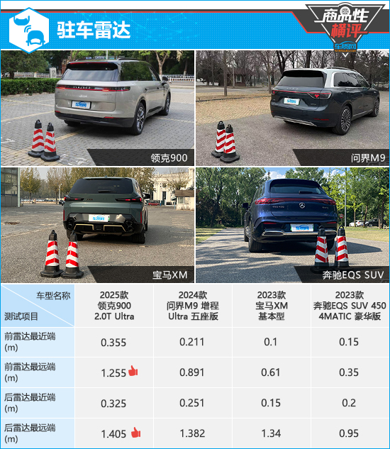在雷达感应测试中,根据已有测试数据来看,无论是前雷达还是后雷达,探测能力最强的都是领克900,相比之下,奔驰EQS SUV的雷达功率明显偏弱。在持续蜂鸣阶段提示距离方面,问界M9的前后雷达测试成绩都与同级别车型测试均值最为接近。