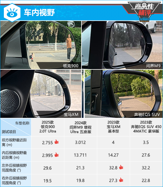 在外后视镜视野范围测试中,得益于双曲率镜片的使用,宝马XM和奔驰EQS SUV两侧外后视镜的视野范围测试成绩均处于同级别车型上游水平。相比之下,问界M9两侧外后视镜视野范围都比较小,测试成绩均处于同级别车型下游水平。
