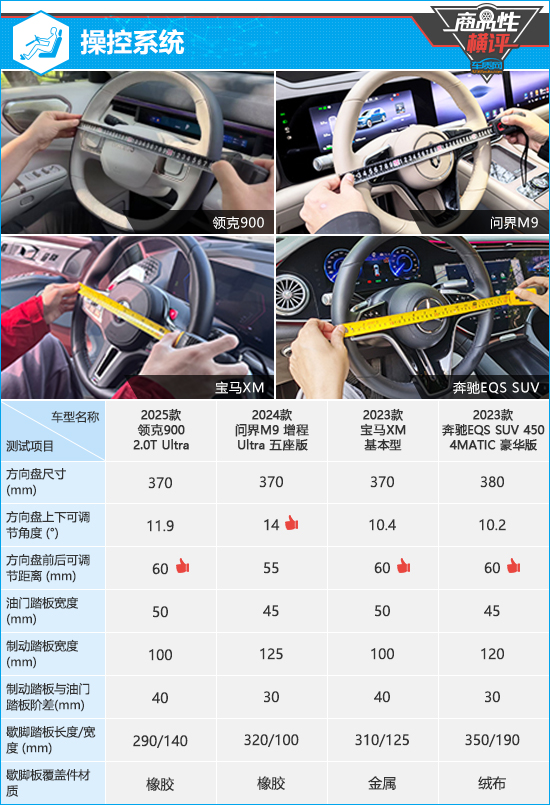 在操控系统方面,除奔驰EQS SUV的方向盘尺寸略大外,其余三款车的方向盘直径均为370mm,可兼顾操控稳定性和灵活性。方向盘调节方面,问界M9在上下调节角度方面处于领先地位,但是其前后可调节距离表现最差,测试数据不及另外三款车型。