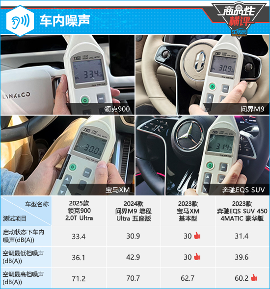 需要说明的是,由于问界M9和奔驰EQS SUV的车顶以及宝马XM的后备厢盖均采用非金属材质打造,因此在测试时未检测到相关数值。