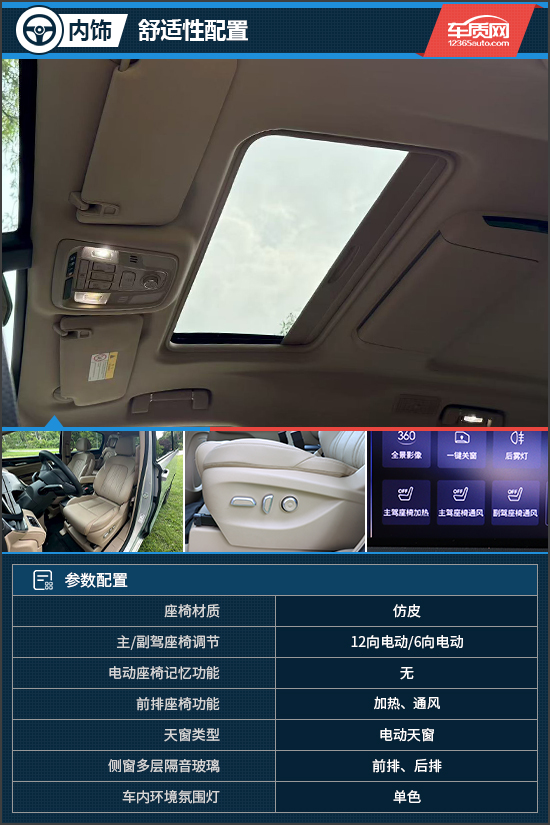 舒适性配置方面,评测车的座椅虽然是仿皮材质,但支持多向电动调节且填充物较为柔软,再加上前排座椅加热和通风功能,乘坐舒适性表现可圈可点。天窗类型为电动天窗,尺寸稍小,并且后排未配备天窗,车内的通透性有待提升。
