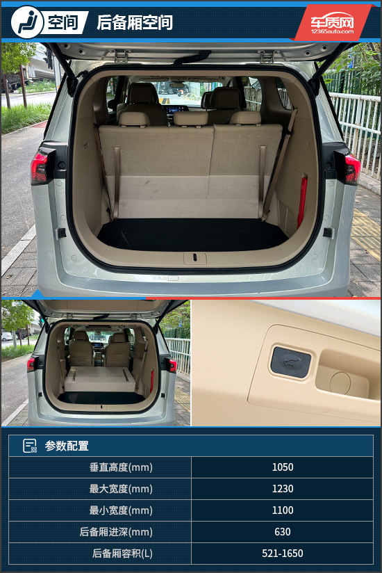 评测车的后备厢内部较为规整,在第三排座椅打开的状态下,放置3-4个登机箱不成问题。而将第三排座椅放倒后,此时容积达到1650L,搬运大件物品不在话下,具有出色的实用性。