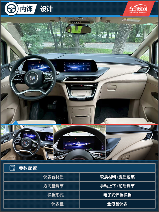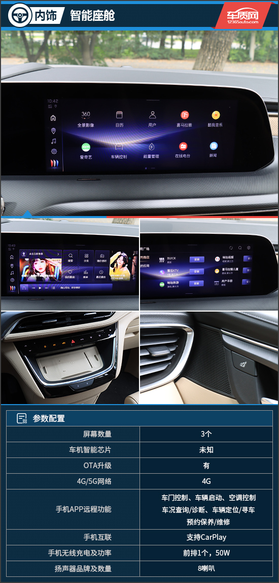 配置方面,评测车配备了双联屏,不仅尺寸宽大,屏幕分辨率也不错,并且车机还内置了别克eConnect车机系统,支持语音连续识别、可见即可说、DeepSeek应用等功能,智能化表现完全不输造车新势力。评测车中控台上方设置了一个手机槽,拿放手机十分顺手,同时还具有50W手机无线充电功能,颇为实用。