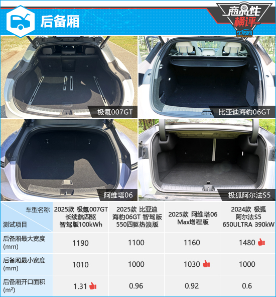 后备厢方面,从实测数据来看,极氪007GT由于采用掀背式设计,因此开口面积占据明显优势,同时后备厢进深也领先于其他三款车。极狐阿尔法S5虽然最大宽度处于领先地位,不过后备厢开口面积相对较小。