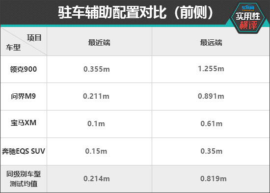 在后驻车雷达测试中,只有奔驰EQS SUV的最远探测距离未达到同级别车型测试均值,另外三款车型的表现均可圈可点。持续蜂鸣阶段提示距离方面,依然还是问界M9的测试成绩与同级别车型测试均值最为接近。