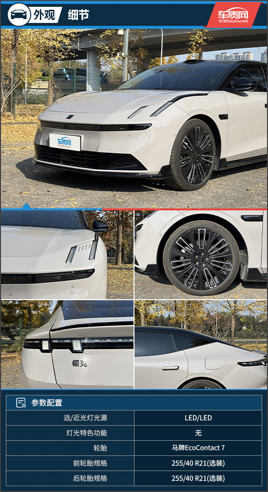 车身侧面采用隐藏式水切设计,不仅样式美观,还优化了空气动力学表现,配合上无框设计车门,视觉效果颇为动感。车尾造型层次分明,贯穿式尾灯极具张力。值得一提的是,评测车选装了锋曜运动套件,除亮黑色车身包围外还包含主动升降隐藏式尾翼,展开后可额外提供约20kg下压力。21英寸锋曜轮毂同属该套件,其造型充满力量感,进一步强化了整车的运动氛围。与之匹配的马牌EcoContact 7轮胎采用创新橡胶配方与胎面设计,兼顾低滚阻、长寿命与静音性能,规格为255/40 R21。