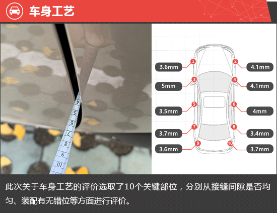 在车身工艺测试环节,整车共选取10个关键部位,每个关键部位都会选取3个关键点进行测量,以评价各关键部位缝隙的均匀程度。从测试结果来看,评测车大部分关键部位的缝隙均值处于合理范围内,仅前翼子板与前车门连接处缝隙均值偏高且左右两侧差值较大,对最终测试成绩造成一定影响。