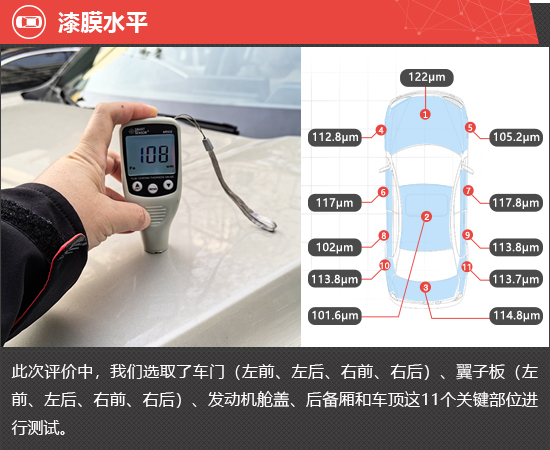 在漆膜水平测试环节,通过测试结果可以发现,评测车整车漆膜平均厚度约为112.2μm,在测试过的同级别车型中处于中下游水平。从各关键部位的测试数据来看,右前翼子板、左后车门以及车顶的漆膜厚度明显偏低,其余部位的测试数值较为接近,整车漆膜厚度和喷涂均匀性均有待提升。
