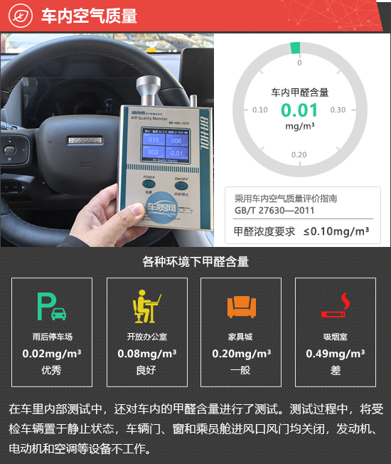 在车内空气质量测试环节,将车辆放置在车辆较少的内部地面停车场中,实测车内甲醛含量为0.01mg/m3,符合2012年3月1日起实施的,由原环保部和国家质量监督检验检疫总局联合发布的《乘用车内空气质量评价指南》(中华人民共和国国家标准GB/T 27630-2011)中的相关标准。