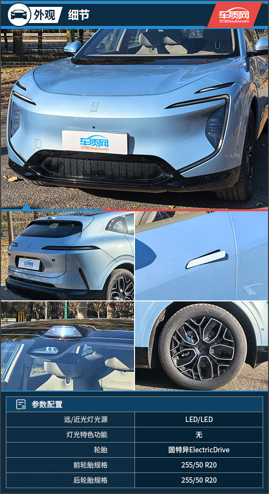 细节方面,评测车头灯内部的C字样式灯带点亮后极具辨识度。车侧隐藏电动门把手的加入,令整车低风阻表现更加出色。同时,全系车型还标配静音电吸门,让上下车仪式感满满。20英寸轮毂造型时尚,与之匹配的轮胎为固特异ElectricDrive,主打抓地力和操控性,对应的前后轮胎规格为255/50 R20。此外,车顶还配备了激光雷达,车尾和外后视镜处均配备辅助驾驶“小蓝灯”。
