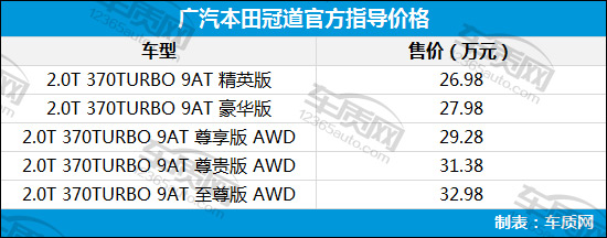 10月29日,广汽本田首款中型SUV冠道正式上市,先期上市车型共推出5款细分配置,采用2.0T发动机搭配9AT变速箱动力组合,售价区间为26.98-32.98万元。另外,搭载1.5T发动机车型将于2017年3月推出,售价22万元起。