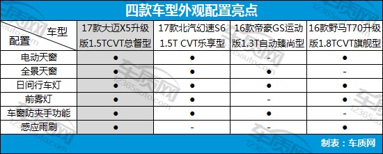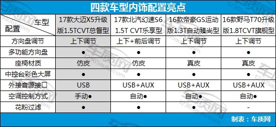 除了老款车型上的黑色和米色内饰,2017款部分车型还可选装酒红色内饰,在同级中颇为罕见。8英寸液晶触控屏响应速度值得肯定,高配车型中带有远程智能控制系统,手机安装大迈管家App后,可进行远程车辆解锁及启闭空调等多种功能。此外下方提供的两个12V电源接口实属贴心之举,可喜的是,新车标配的PM2.5绿净系统可以进一步提升车内空气质量。