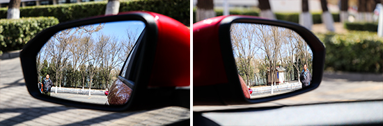 虽然没有配备双曲率后视镜,但由于吉利远景X3本身车型尺寸并不大,视野盲区比较小,所以也无可厚非。实际测试中,后视镜的面积比较大,能够让驾驶员观察到更多的车后信息,左侧18°和右侧16°的可视范围还算不错。