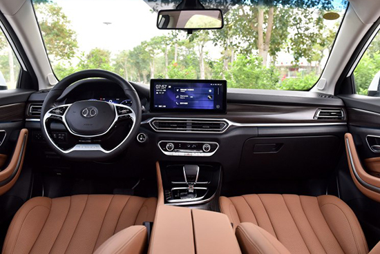 内饰采用双色搭配设计,多功能三辐方向盘和中控台加入了镀铬与烤漆装饰。中控台为标准T字造型,中间配备12.3英寸大尺寸悬浮液晶显示屏。配置方面,搭载绅宝智行上使用最新车载互联系统,配备了AI车况管家、AI语音助手和AI安全卫士等等。