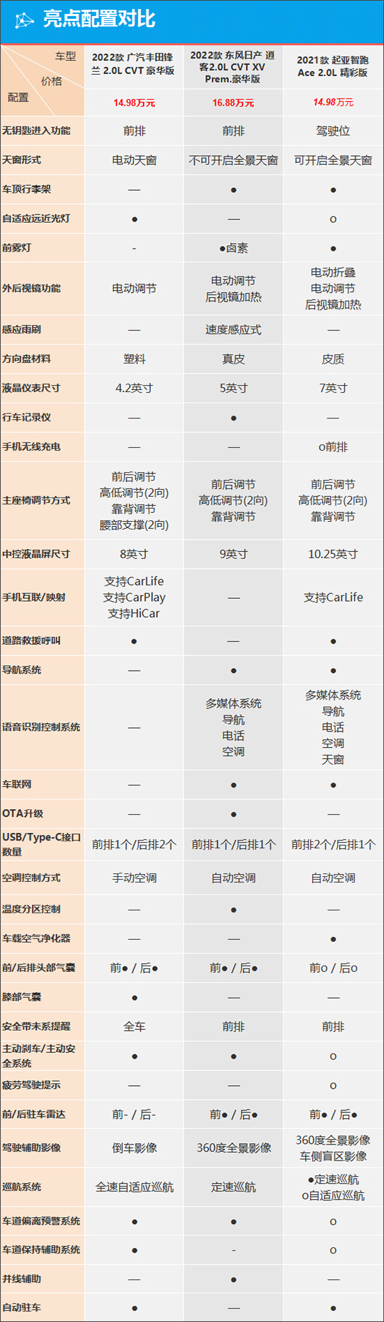 为便于进行配置对比,我们选取了三款中配车型进行横评。通过对比可以看到,三款车型中逍客售价最高,且这样的价格还可以买到锋兰达的顶配车型。相比之下,起亚智跑整体配置表现与逍客相似,不过售价控制在了15万以内,性价比十足。在具体配置方面,三款车型的侧重点有所不同。得益于Toyota Safety Sense智行安全系统,锋兰达在安全方面表现较为出色,例如主动刹车、车道偏离预警、车道保持辅助均有搭载。在娱乐方面,该车虽然支持多种手机互联,但是在车联网、OTA升级等智能化方面,不及另外两款车型。