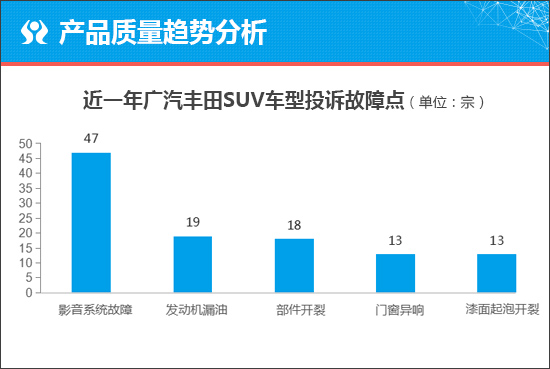 作为广汽丰田旗下全新车型,锋兰达是否会有发生质量问题的隐患?对此,我们将从过去一年锋兰达车型的故障入手,通过故障问题比对,从而初步预测未来新车质量问题的发展趋势。由于锋兰达为全新车型,因此我们将通过对广汽丰田SUV车型近一年来的投诉情况进行分析。