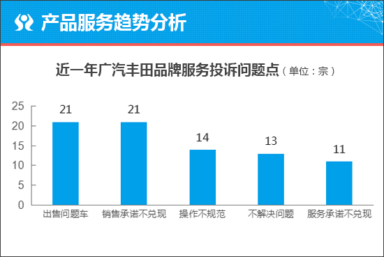由于锋兰达为全新车型,因此我们将通过对广汽丰田近一年来的服务问题投诉情况进行分析。通过筛选广汽丰田的投诉数据可以发现,投诉量相对较多的问题为“出售问题车”以及“销售承诺不兑现”,投诉量均为21宗。