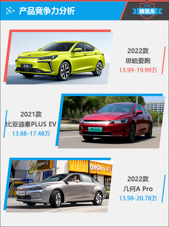 即便紧凑型纯电轿车市场已经有了许多非常有竞争力的车型,但思皓爱跑依然有着不错的竞争力。此次,我们便选择了两款时下有着非常高热度的紧凑型纯电轿车作为思皓爱跑的竞争对手,它们分别是搭载刀片电池技术的比亚迪秦PLUS EV以及前不久刚刚完成改款的几何A Pro。
