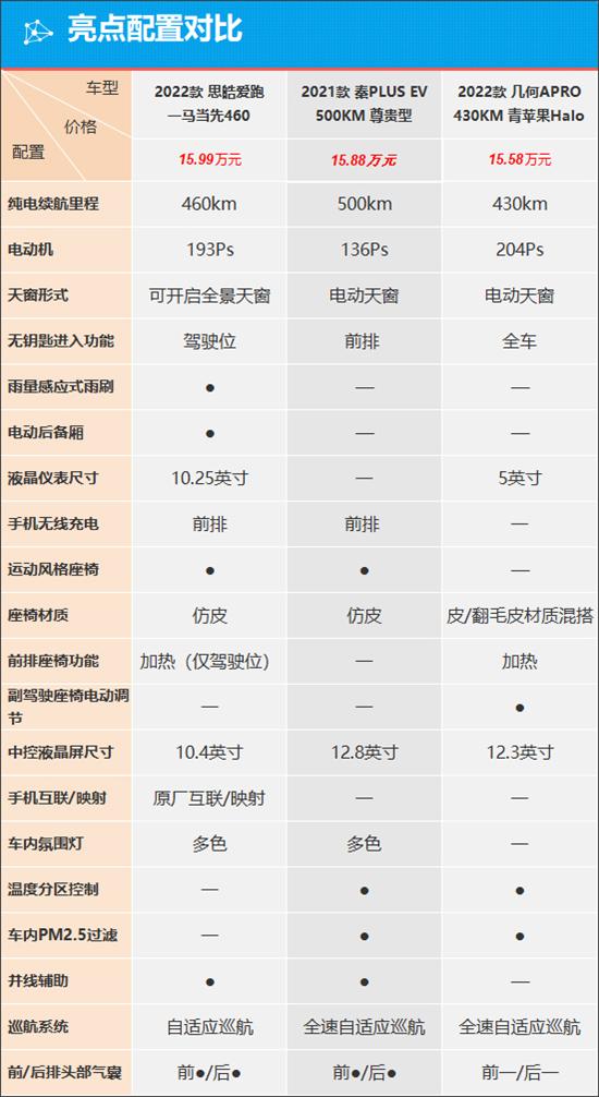通过配置分析可以发现,在价格相近的情况下,三款车型各有千秋。其中思皓爱跑配备的可开启全景天窗、雨量感应式雨刷以及电动后备厢等配置颇为诱人,对实用性帮助很大。而比亚迪秦PLUS EV和几何A Pro则是对车内其它乘客更为友好,提供了温度分区控制空调和车内PM2.5过滤装置,但在其他实用配置方面有所缺失。相比之下,思皓爱跑的配置更加完善。