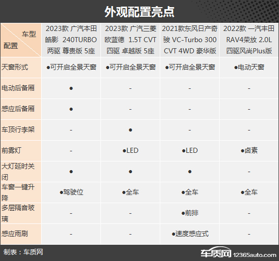 由于车型定位以及售价等因素,四款车型在外观配置上各有千秋,各自都有独享的配置。如东风日产奇骏在四款车型中独享速度感应式雨刷、前排多层隔音玻璃;而广汽本田皓影还独享电动/感应后备厢功能。相比之下,一汽丰田RAV4整体表现较为基础,略逊色于其他三款车型。