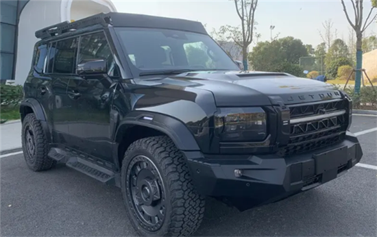 详细来看,该车的外观采用了十分硬派的设计,全车均采用了黑化处理,并进行了大量的越野升级,例如棱角分明的前保险杠、隆起的机盖以及向外突出的轮眉,都彰显了该车的硬派气息。