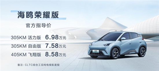 3月6日,比亚迪海鸥荣耀版正式上市,新车推出3款车型,售价区间6.98-8.58万元。新车除了优化了部分配置外,还新增了北冰蓝外观+深海蓝内饰配色,带给用户更多的选择。续航方面新车提供305km和405km两种版本可选。
