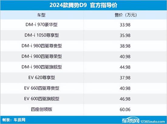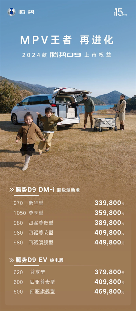 3月6日,2024款腾势D9正式上市,新车推出9款车型,售价区间33.98-60.06万元。作为年度改款车型,新车改进和优化了多种配置和功能,老车主可享置换补贴3万元,增购补贴1万元以及专属贵宾服务权益继承等。