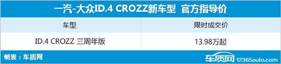 3月8日,一汽-大众ID.4 CROZZ三周年版车型正式上市,新车的限时成交价为13.98万起。新车基于纯享限量版车型升级而来,主要针对配置进行优化,并增加三周年版车型专属外观标识。