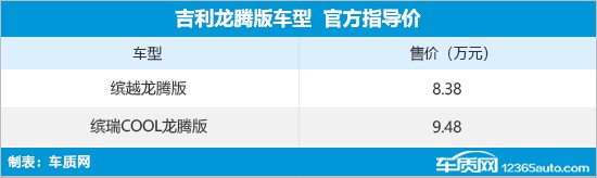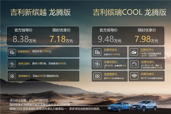 3月8日,吉利缤越/缤瑞COOL龙腾版车型正式上市,其中吉利缤越龙腾版售价为8.38万元,吉利缤瑞COOL龙腾版售价为9.48万元。此外官方还为此提供了限时优惠价,截止日期为3月31日前,两款车型的限时优惠价分别为7.18和7.98万元。