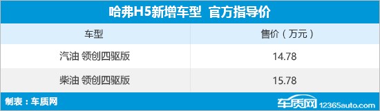 3月4日,车质网从相关渠道获悉,哈弗H5新增车型正式上市。新车共推出两款车型,分别为汽油 领创四驱版和柴油 领创四驱版,售价为14.78-15.78万元。相比现款车型,新车提供了更加丰富的选装包,包括舒享升级包、科技升级包等。