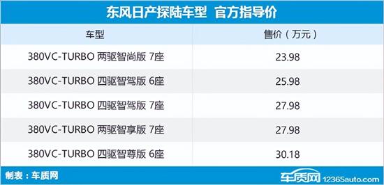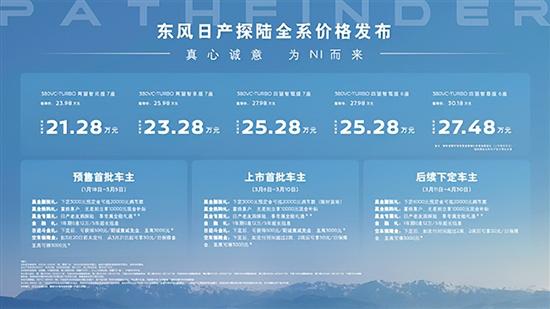 3月6日,东风日产官方宣布旗下全新中大型SUV——探陆(Pathfinder)正式上市。新车共推出5款配置车型,售价区间为23.98-30.18万元。另外官方还推出了限时诚意价,售价区间为21.28-27.48万元。探陆采用东风日产电气化车型最新的设计风格,具备较强的科技感,动力方面搭载2.0T发动机。