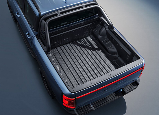 车尾方面,新车采用大尺寸BYD品牌LOGO,以提升辨识度。竖状尾灯组和贯穿式灯带与车头形成呼应。车身尺寸方面,新车长宽高分别为5457mm*1971mm*1925mm,轴距3260mm;接近角和离去角分别为31°和19.3°,满载离地间隙210mm。货箱容积达到1450L,能够满足日常载货需求。