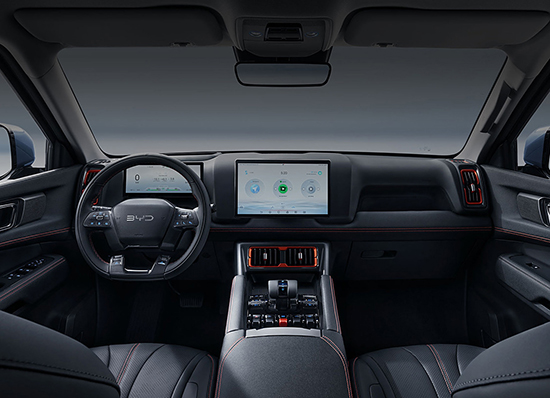 比亚迪SHARK内饰保留比亚迪经典的可旋转式12.8英寸中控屏,内置智能语音、540度全景影像和唱吧等功能,还可支持Apple CarPlay/Andriod Auto手机互联。四辐式方向盘前方配备10.25英寸液晶仪表,高配车型还配备12英寸W-HUD抬头显示屏。