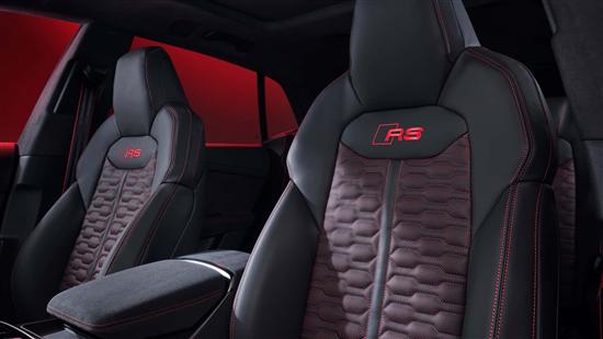 内饰的整体设计风格和布局同样与奥迪Q8保持一致,不过细节处进行了调整与升级。座椅采用了带有蜂窝状缝线的打孔真皮,方向盘和前排中央扶手等处辅以Alcantara翻毛材质包裹,电子挡杆以及其他物理操控区域则为回收再生的微纤维材料制成。