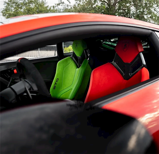 内饰方面,"Huracán STO Unica”延续了意大利国旗的色彩风格,主驾驶座椅采用红色Alcantara面料,副驾驶座椅则为绿色,与车身外观的配色相得益彰。